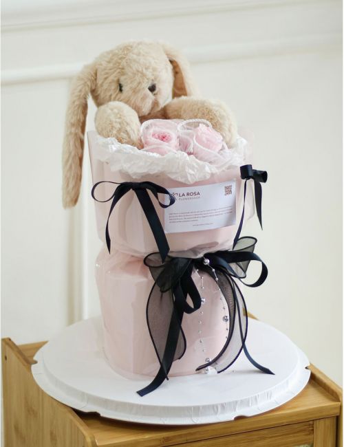 The perfect blend of softness and elegance with this charming gift set featuring a cuddly plush bunny nestled among 3 delicate preserved pink david austin roses. Beautifully arranged in a pastel pink wrapping adorned with delicate black ribbons. The preserved david austin roses lasting for 4-5 years.