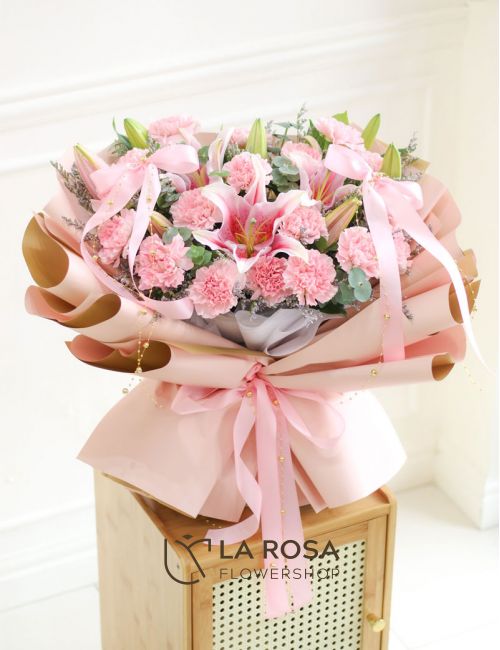 A modern bouquet arrangement of 18 fresh pink carnations, three stargazer lilies and eucalyptus—elegantly wrapped for a clean, timeless finish.