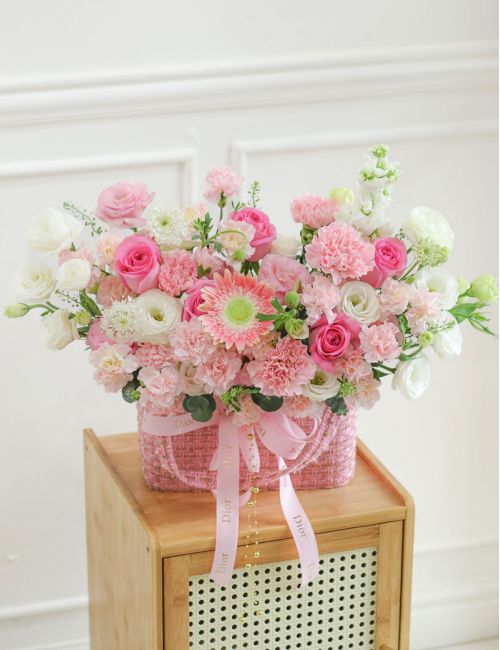 A fresh flower basket arrangement consists of 4 hot pink imported roses, 4 blush pink carnations, 3 pink spray carnations, 3 white lisianthus, 2 pink lisianthus, single white matthiola, single pink gerbera and lepidium as fillers.