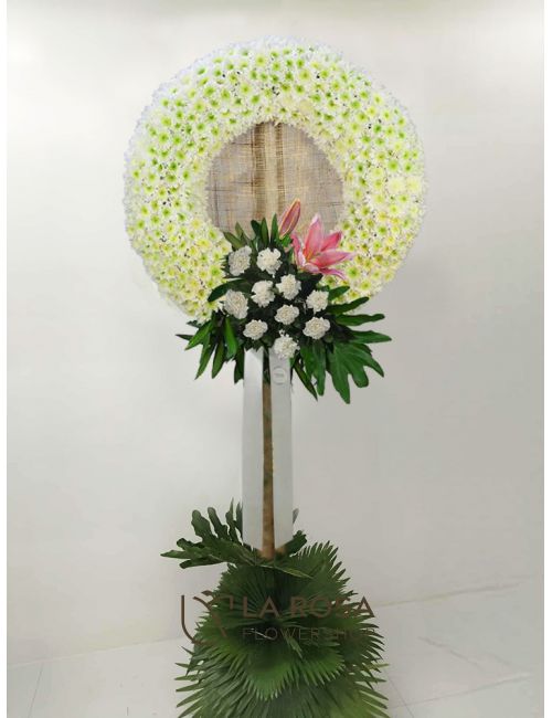 Sympathy wreath made of white chrysanthemum flower with 10 pieces white carnations., single stem stargazer lily and green foliage in drift wood standee